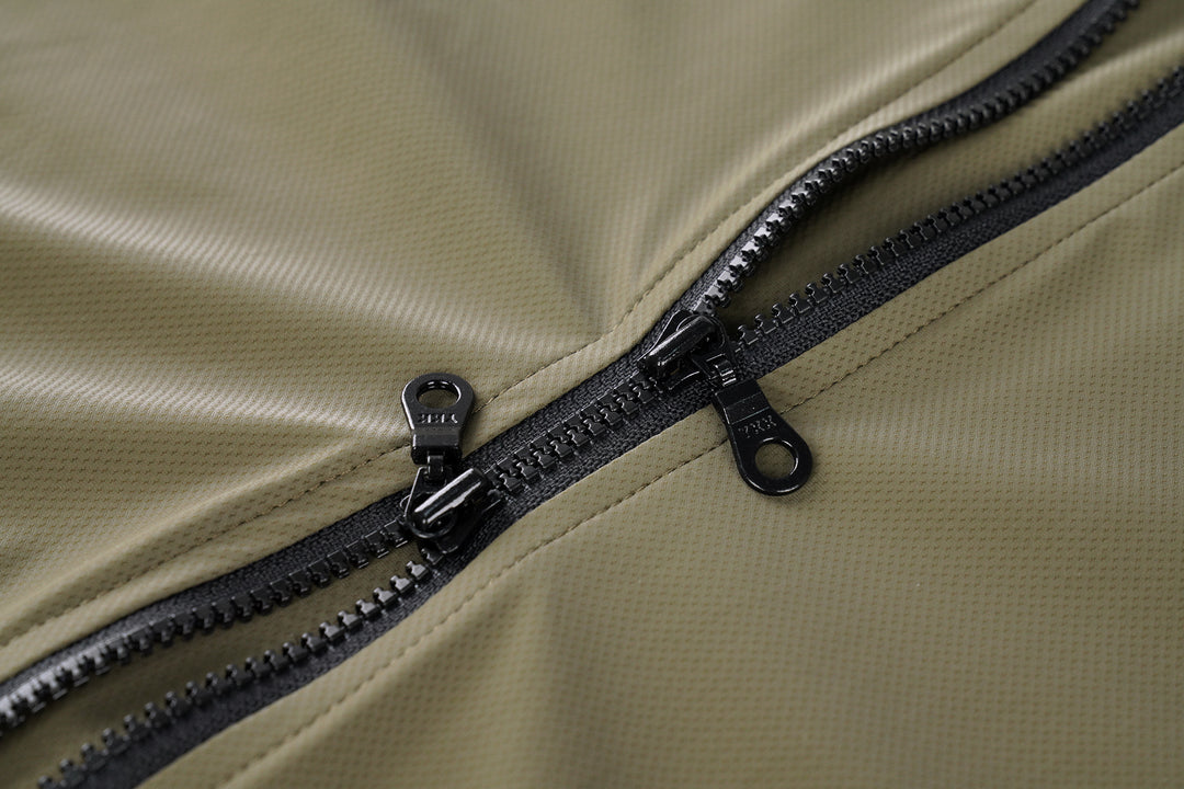 Featuring a black YKK two-way zipper with an internal double-layer flap, the windbreaker ensures durability and protection against wind and rain.