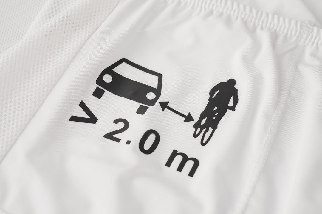 A printed 2.0m safe distance graphic promotes road awareness, encouraging vehicles to pass cyclists responsibly.