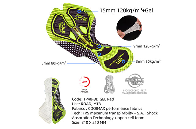 The 3D GEL Pad combines COOLMAX fabric, TRS breathability, S.A.T shock absorption, and open-cell foam to deliver superior comfort for road and MTB riding.