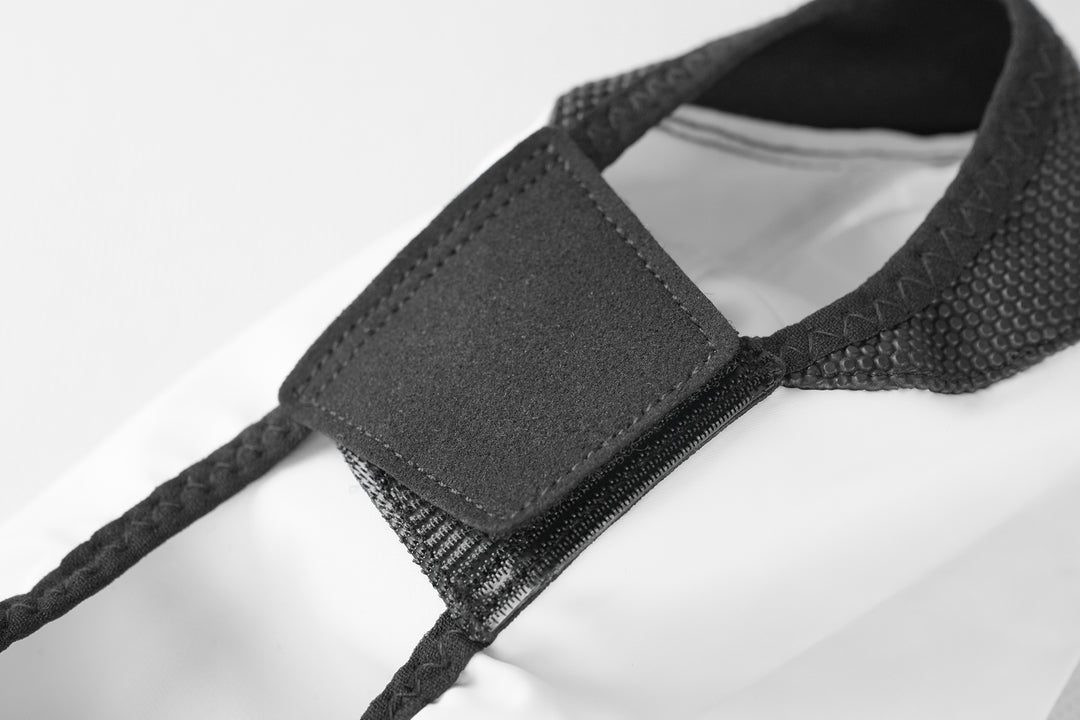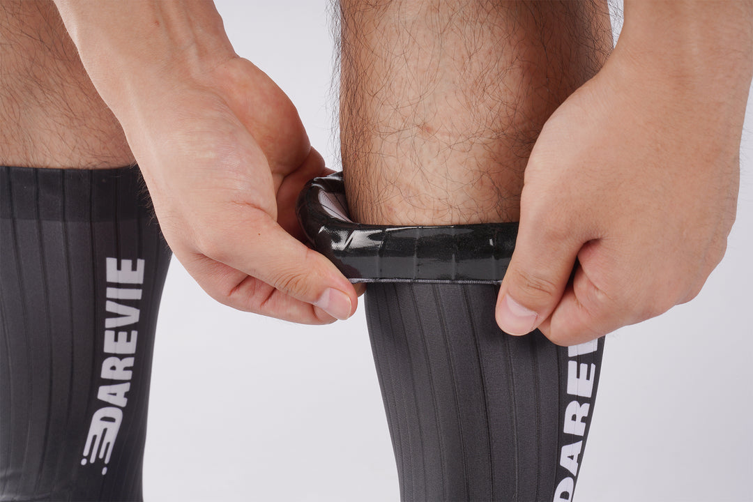 The overshoe features aerodynamic striped fabric on the shaft section to improve airflow around the leg, and non-slip silicone grippers on the cuffs keep the overshoe in place for optimal aerodynamic performance.